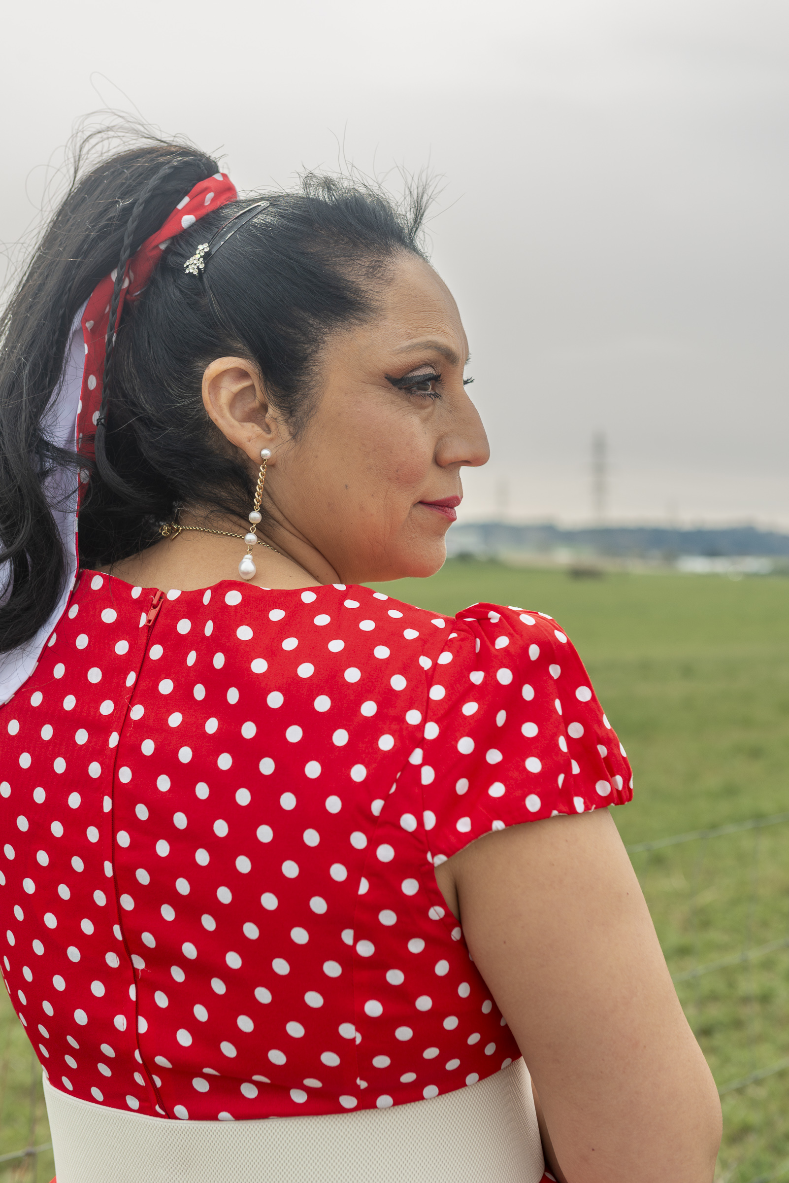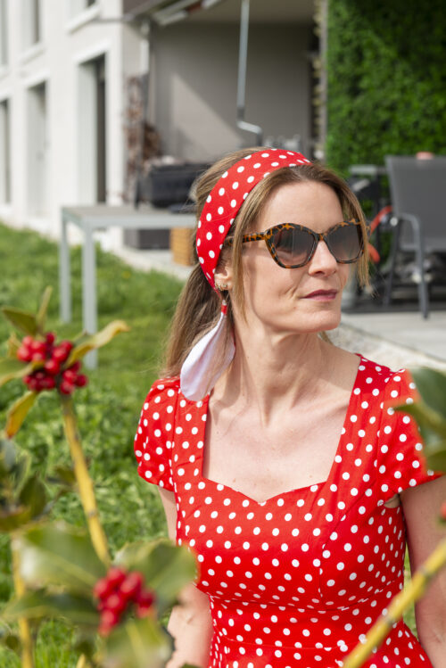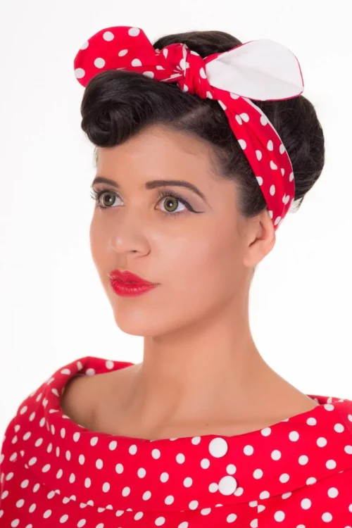Bandeau rouge à pois blancs avec nœud modulable, l’accessoire pin-up iconique pour une allure glamour instantanée.