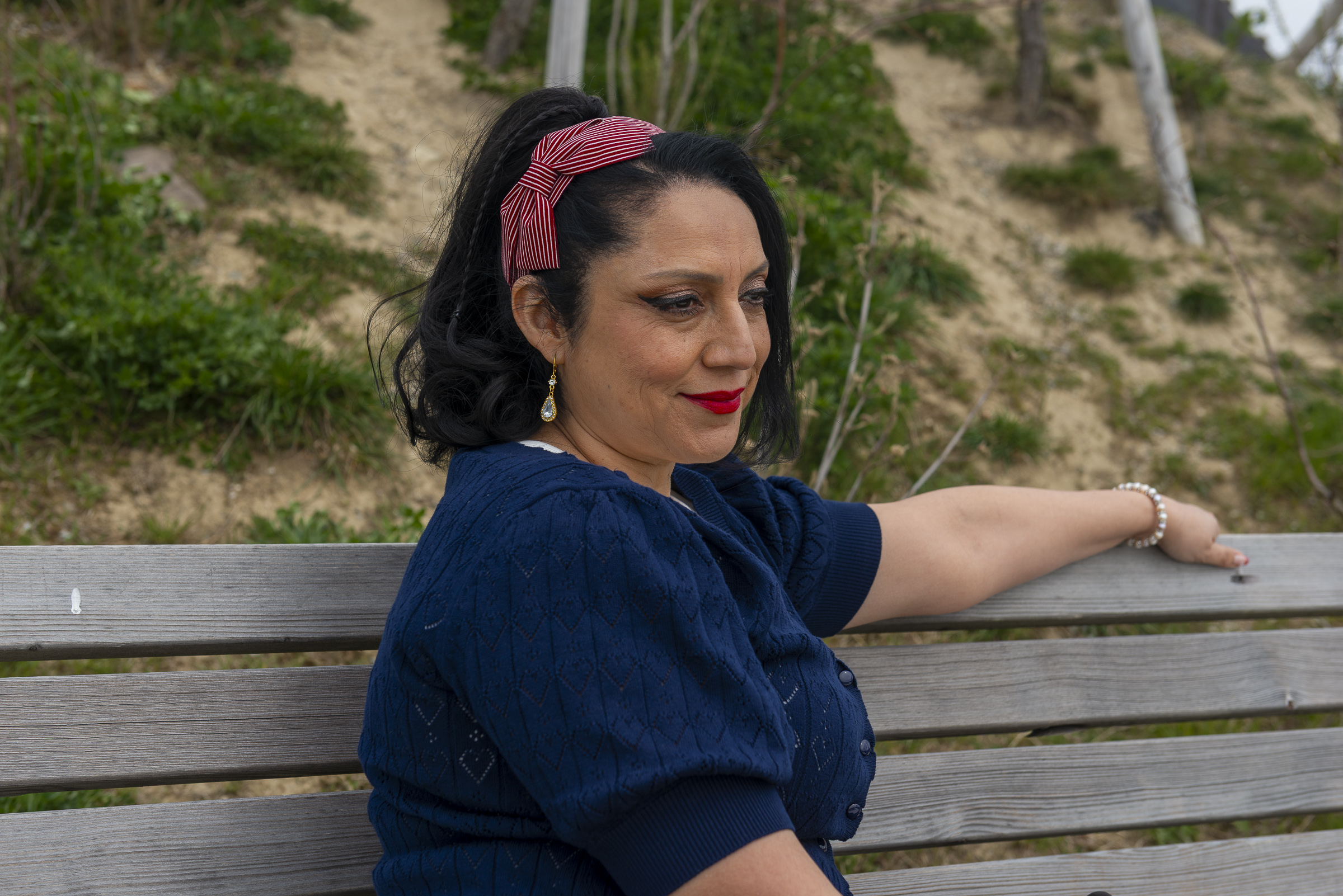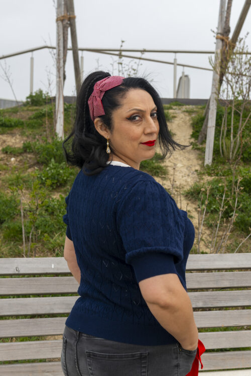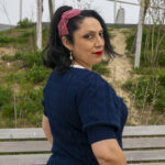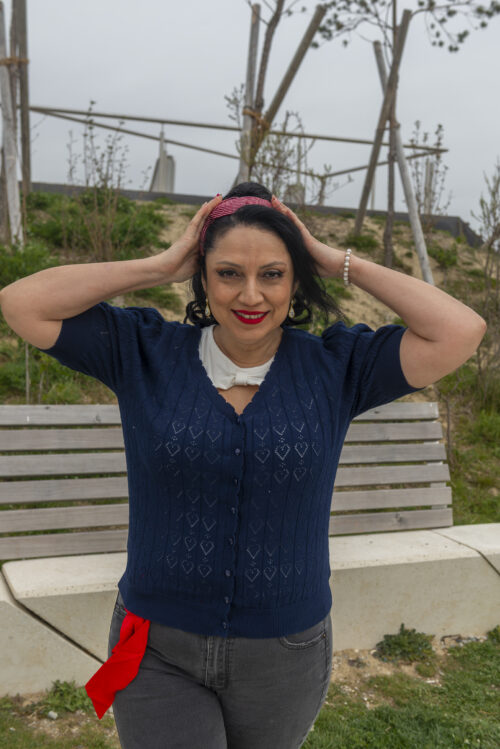 Un cardigan bleu marine au charme rétro, délicatement ajouré de motifs cœurs, pour un look pin-up doux et élégant.