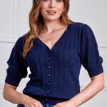 Sa coupe ajustée met en valeur la silhouette, tandis que ses manches légèrement bouffantes ajoutent une note vintage pleine de charme. Boutonné sur le devant, il peut se porter aussi bien fermé que légèrement ouvert pour varier les styles.