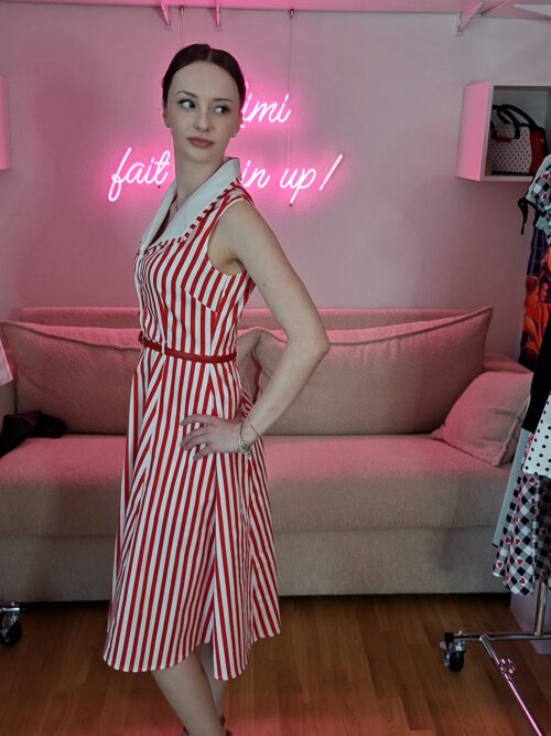 Succombez au charme rétro de la robe Riviera rayures! Avec ses rayures rouges et blanches ultra vintage, son col contrasté et sa coupe évasée flatteuse, elle sublime la silhouette dans un esprit pin-up plein de fraîcheur. Sans manches et cintrée à la taille, elle est parfaite pour un look rétro chic, aussi bien au quotidien que pour une sortie estivale.